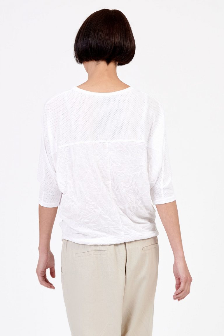 | חולצה בגיזרת עטלף, עם מפתח צוואר עגול ושרוולים 3/4. החלוצה תפורה משני בדים בטקסטורות שונות. האחד מקומט והשני בג'קרד עם חורים עדינים. |