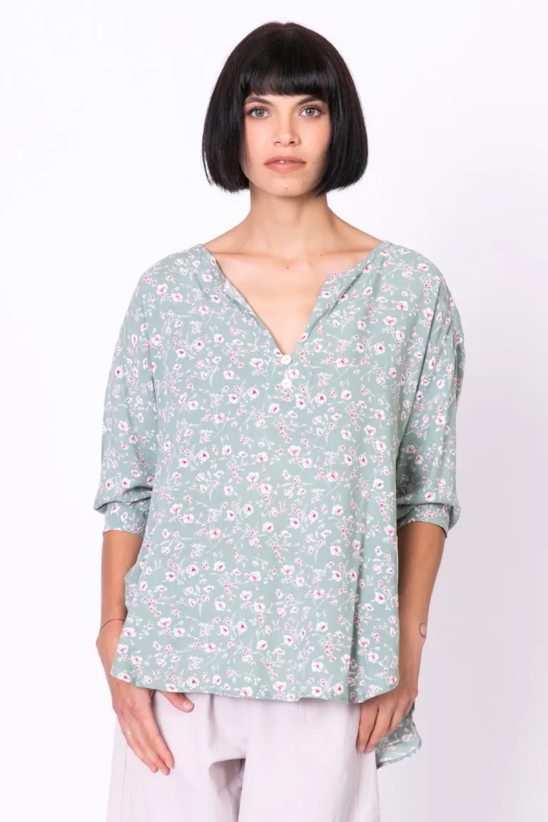 | חולצה מבד ויסקוזה מקולקצית NATURAL. לחולצה מפתח צוואר מעודן עם שני כפתורים ושרוולים באורך 3/4 עם מנג'טים. |